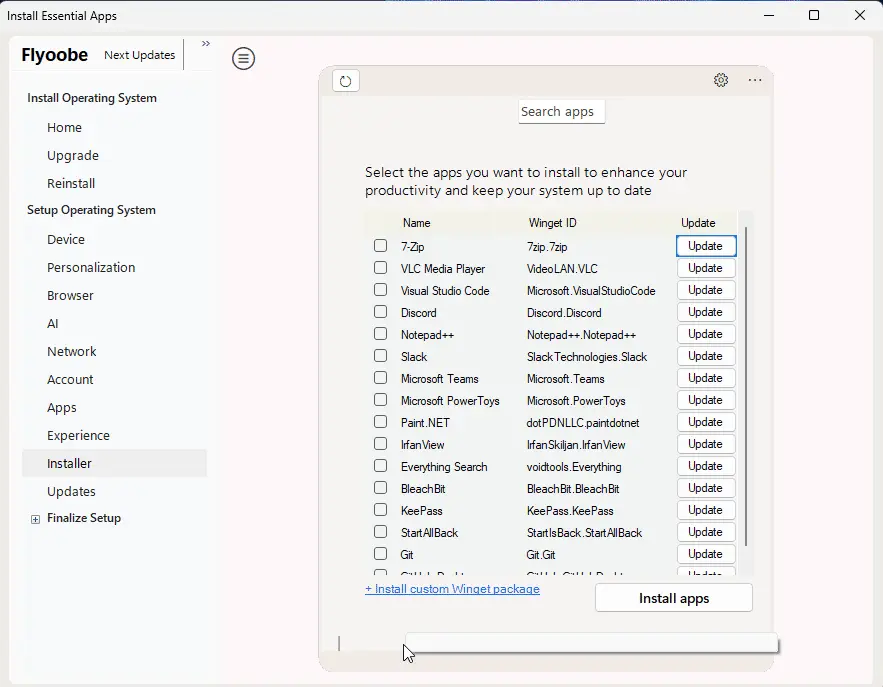 One of the best things about this release is the better OOBE (Out-of-Box Experience) installer. It now lets users search for and install app packages directly from the Winget manifest. You can do this by using the "Install custom Winget package" option. However, it's important to note that this feature is somewhat less advanced than UnigetUI, but it still keeps Flyoobe fast and efficient by being lightweight.