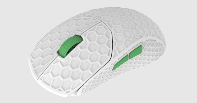 The ambidextrous VUK innovates in several ways. Aside from featuring a dual-sensor design, it also implements SR latch debouncing for the lowest possible click latency. The VUK only weighs 36 g, despite being medium size and having no holes in the upper shell. PixArt's PAW3950 sensor and 8000 Hz wireless complete the package.