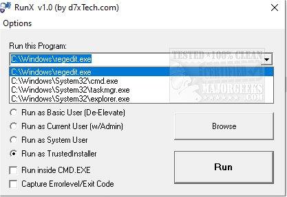 RunX can launch any process with System Account or TrustedInstaller account privileges bypassing file system and registry permissions. RunX Usage is simple, drag n' drop an executable into RunX.exe, or launch it normally and browse/type in the path to an executable. For scripting purposes, when you need your script to wait on the process, you are running to terminate, and/or when you or your script needs to know the process exit code via %errorlevel% output.