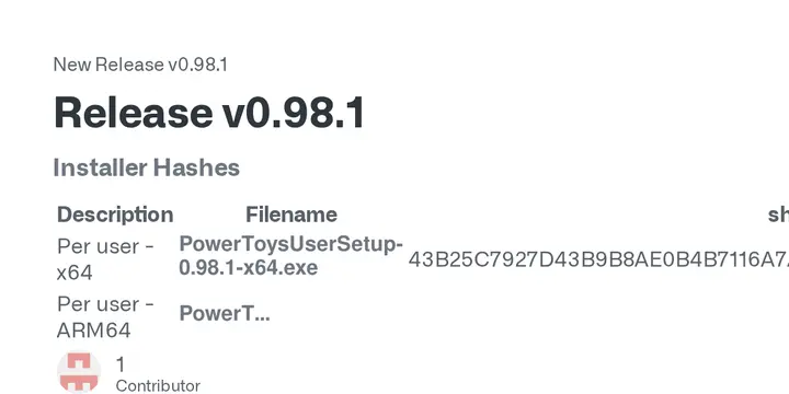 Description Filename sha256 hash Per user - x64 PowerToysUserSetup-0.98.1-x64.exe 43B25C7927D43B9B8AE0B4B7116A7A4FFCA66FAE031BCF4B30FE38AC382C6F35 Per user - ARM64 PowerToysUserSetup-0.98.1-arm64.exe E52788F0B199433A56B0CEA5DDA3611DA2F9D0AF123E2E90F9A908D8164AAD20 Machine wide - x64 PowerToysSetup-0.98.1-x64.exe FC417BF42D6497A87682286FB541D4FA789EF0E4A812571BC0C2E4D591E63CAA Machine wide - ARM64 PowerToysSetup-0.98.1-arm64.exe DD9F1E0243A16ADAA831F8E1119AE7394CB031B5B12401A0A243880F8F099545