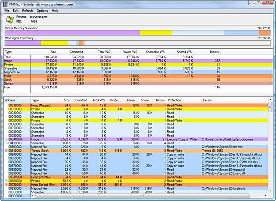 VMMap is a process virtual and physical memory analysis utility. It shows a breakdown of a process´s committed virtual memory types as well as the amount of physical memory (working set) assigned by the operating system to those types.
